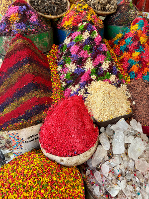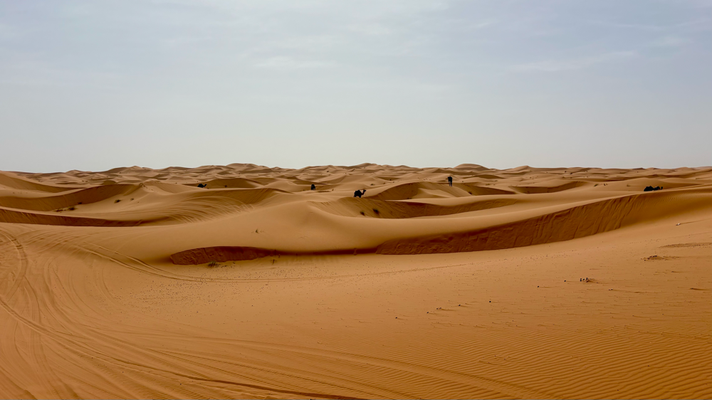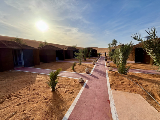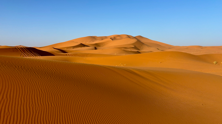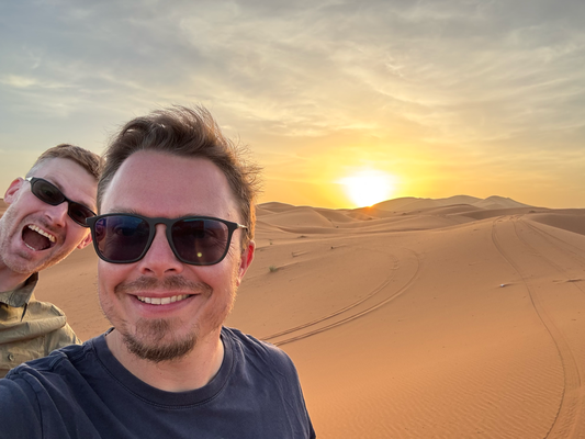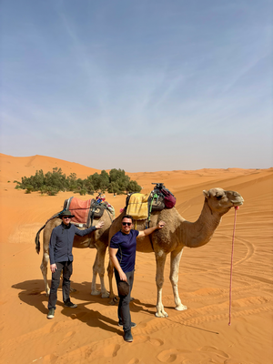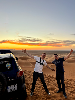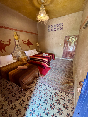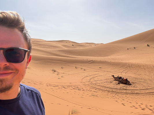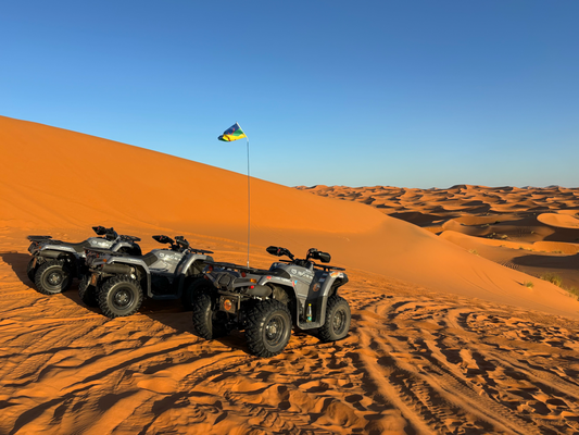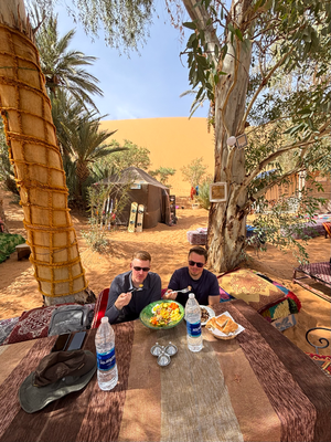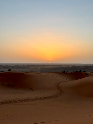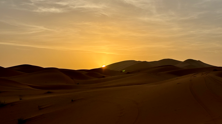 Pünktlich 10 Uhr standen unser Expeditionsführer und zwei gesattelte Kameldamen direkt vor der Tür. Bewaffnet mit dem Nötigsten, vorallem für jeden eine große Flasche Wasser, starteten wir den Weg in die Wüste, während unser Übernachtungsgepäck per Jeep ins Camp gefahren wurde. Wackeliger als ich dachte, aber dennoch angenehm und gemächlich, ging es 2 Stunden quer durch die Dünen. Die Temperaturen waren erträglich und der kühlende Wind machte es zusätzlich aushaltbar. Zum Mittag erreichten wir eine Oase, wo wir mit reichlich Essen und Minztee versorgt wurden. Ich erkundete zu Fuß die Gegend und kletterte auf die höchste Düne für einen Rundumblick bis nach Algerien. Danach war Siesta im Schatten der Oasenbäume angesagt. Ab und zu kamen Spanier mit ihren Jeeps, Quads oder lautstarken Dünenbuggies vorbei. Außerdem gab es zahlreiche Motocrossfahrer, die diesen riesigen Sandkasten als Spielwiese nutzten. Man ist in Erg Chebbi nie alleine! 16 Uhr ging es weiter bis zum Camp, wo wir duschten und den wunderschönen Sonnenuntergang genossen. Anschließend gab es Abendessen unter einem überwältigenden Sternenhimmel. Selbst die Milchstrasse war aufgrund der fehlenden Lichtverschmutzung deutlich zu erkennen. Ein Traum. Am nächsten Morgen beobachteten wir den Sonnenaufgang über der algerischen Grenze und machten uns nach dem Frühstück wieder auf den Rückweg. Zurück in Merzouga schlenderten wir durch die kleinen Strassen, kauften Gewürze und überbrückten im Restaurant die Zeit bis zur abendlichen Quadtour. Und was soll ich sagen. Mit dem 500ccm Quad bei Sonnenuntergang durch die Wüste zu heizen ist einfach mal das Geilste der Welt!