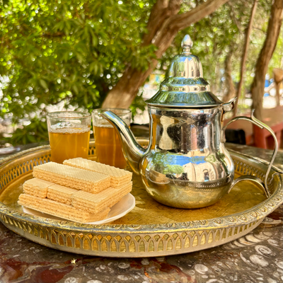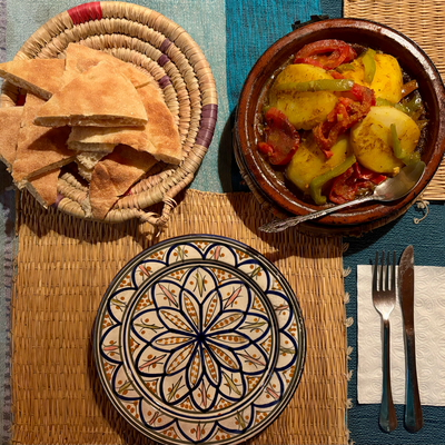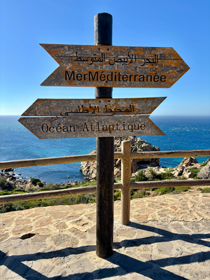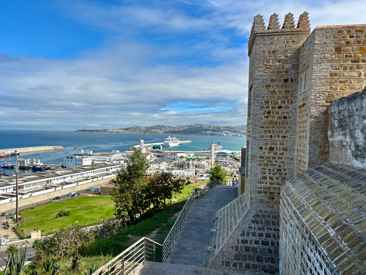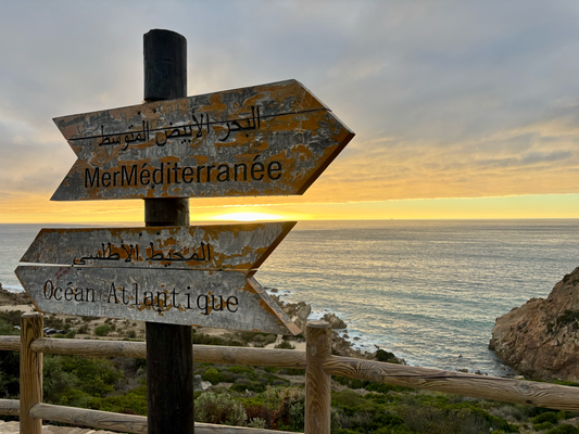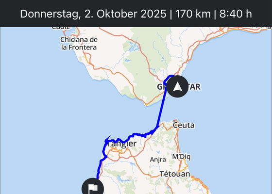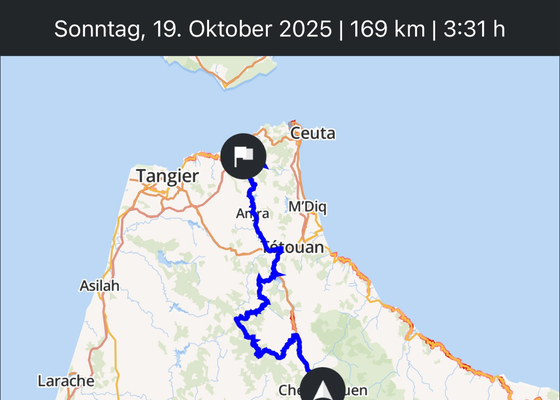Ab 8 Uhr bot unser Wellness-Hotel zu unserer großen Freude ein sehr umfangreiches und internationales Frühstücksbuffet an, denn die letzten morgendlichen marokkanischen Stärkungen beschränkten sich meistens auf Minztee, Orangensaft, Crêpes, Fladenbrot, Honig, Marmelade, Butter, Streichkäse, Omlett und Oliven. Lecker, aber Abwechslung nach zwei Wochen tut auch mal gut. Satt und zufrieden traten wir die letzten 169 Kilometer bei 28 Grad Celsius auf marokkanischen Boden an. Zum Glück gab es für den Abschluss nochmal feinsten Asphalt und ein paar Kurven durch die beliebteste Wandergegend ganz im Norden des Landes. 16 Uhr trafen wir in unserer schönen Unterkunft mit Bergpanorama ein, wo wir gleich nach dem Duschen ausgiebig bekocht wurden. Am nächsten Morgen organisierte uns unsere Gastgeberin ein Großraumtaxi nach Tanger, da wir unseren „Puffertag“ zum Sightseeing und Shopping nutzen wollten. Zwei Euro für 40 Kilometer auf der hintersten Sitzbank eines Dacia mit vier weiteren Fahrgästen und einem Fahrer, bei dem man den Angstgriff ganz doll festhalten sollte. Lebend erreichten wir unser Ziel und schlenderten am Hafen entlang sowie durch die Medina. 15 Uhr trafen wir uns mit dem Bruder der Familie, die wir in El Jadida besucht hatten. Auch hier wurden wir sehr herzlich empfangen, kulinarisch versorgt und bekamen Unterstützung beim Einkaufen im lokalen Gewürzladen. Als krönenden Tagesabschluss fuhren wir noch mit Kind und Kegel zum Sonnenuntergang ans Cap Spartel, wo die Reise durch Marokko vor 20 Tagen begann.