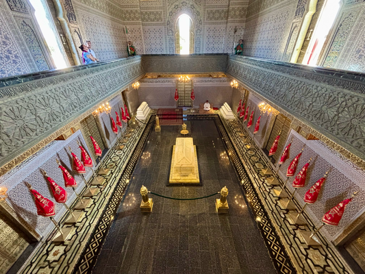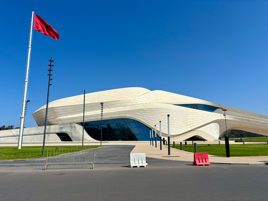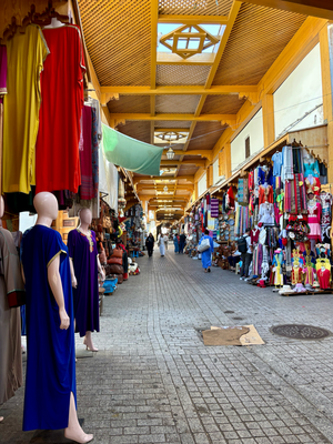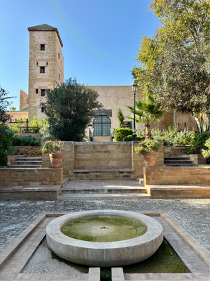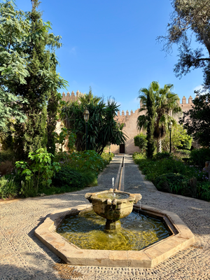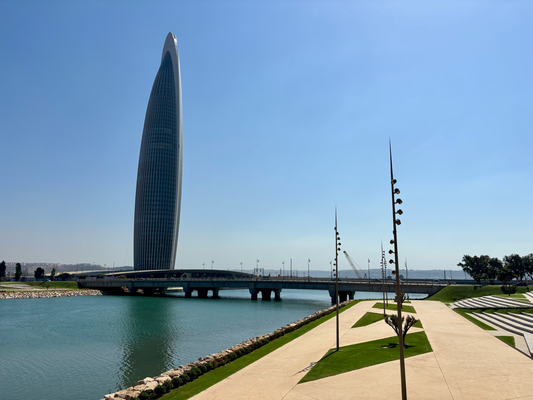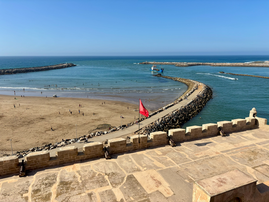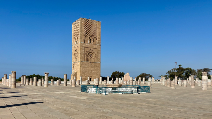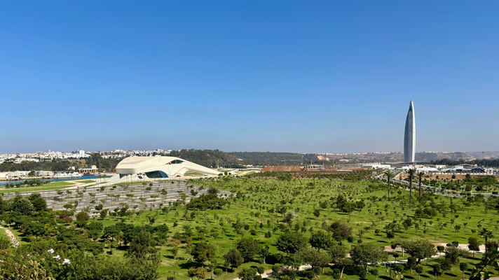 Zum ersten Mal wurden wir gegen 6 Uhr durch den Muezzin einer benachbarten Minarett leicht geweckt, um dann nochmal bis kurz vor dem Frühstück ab 8 Uhr weiter zu schlafen. Gestärkt sattelten wir die Maschinen und bezahlten den Nachtwächter, der unsere direkt vor dem Hoteleingang auf dem Fußweg geparkten Motorräder draußen auf einem Stuhl sitzend bewacht hat, mit 40 Dirham. Wie gesagt, 20 bis 50 Dirham sollte man immer in Scheinen dabei haben, um zum Beispiel auch Tankwärter oder Kofferträger mit Trinkgeld zu würdigen. So taten wir es auch nach 208 Kilometern in unserem nächsten Hotel in der Landeshauptstadt Rabat, wo der Concierge uns unsere Maschinen in den Gepäckraum des Hotels fahren ließ. Mit so viel Tatendrang für die Sicherheit unserer Sachen hatten wir nicht gerechnet. Doch umso erleichterter gingen wir nach drei Stunden Autobahnfahrt duschen, um dann ab 14.30 Uhr die Stadt zu erkunden. Auf dem Plan standen das geschwungene Theatre Royal (von der renommierten Architektin Zaha Hadid vor ihrem Tod entworfen), der Royal Mansur (Hochhaus für eine Akademie der Gastronomie), der Tour Hassan (Minarett mit dem dazugehörigen königlichem Mausoleum), dem Jardin Andalous (ruhige Gartenanlage zum Verweilen) und die Medina mit ihrem farbenfrohen Souk (Markt) und der beeindruckenden Stadtmauer, die direkt an den Atlantik grenzt.
