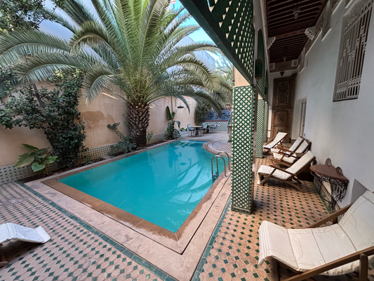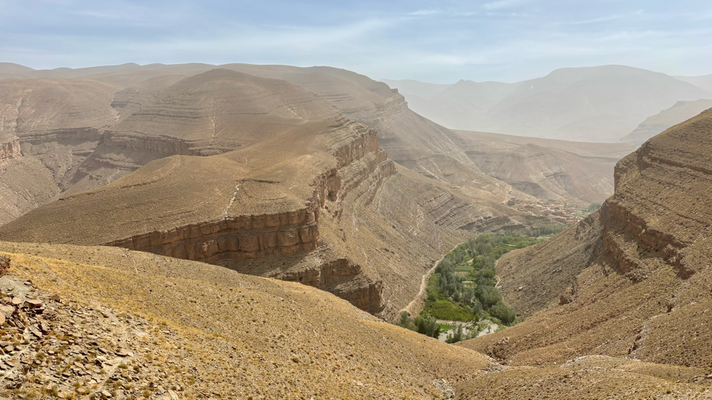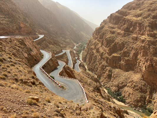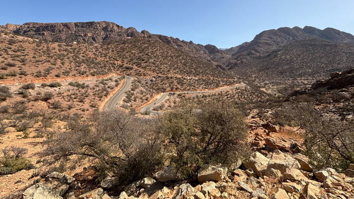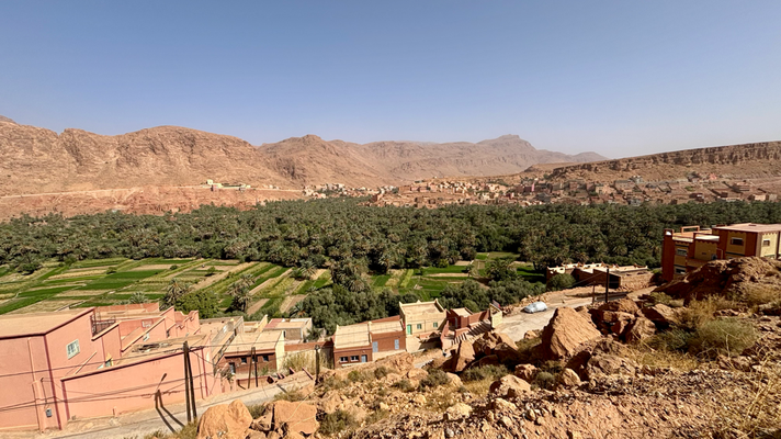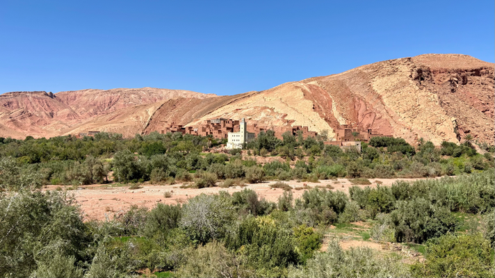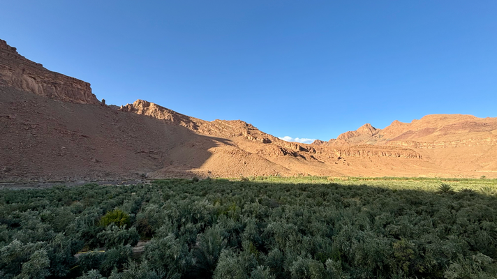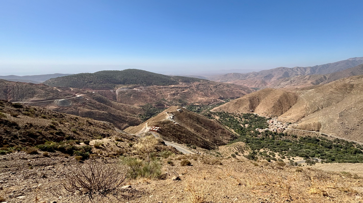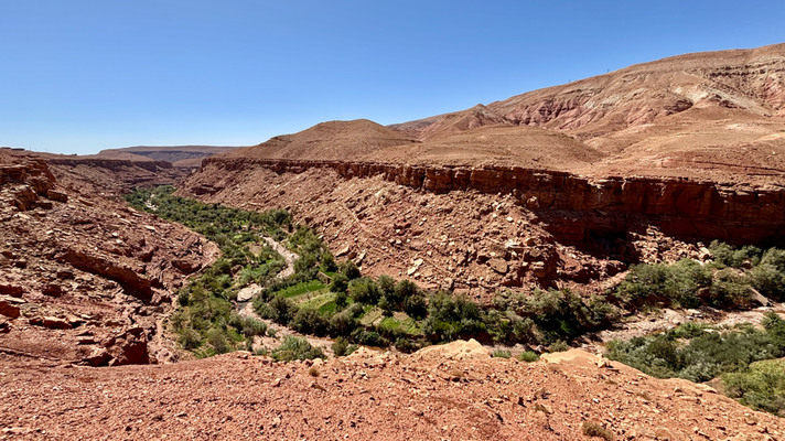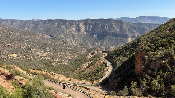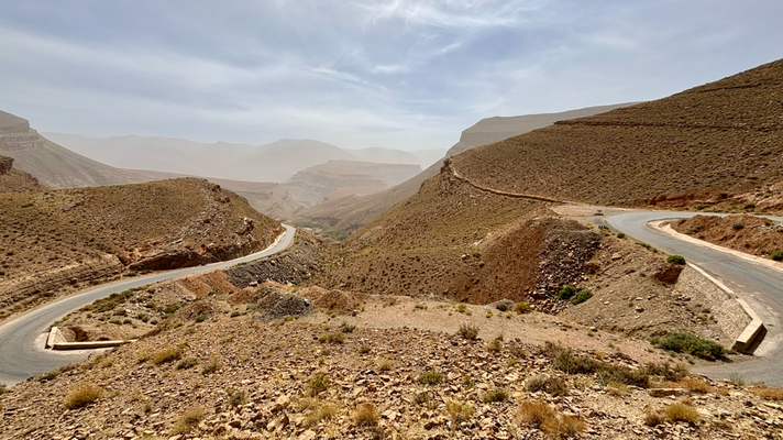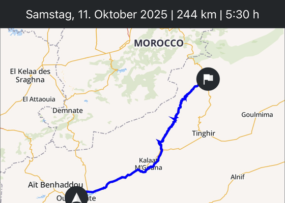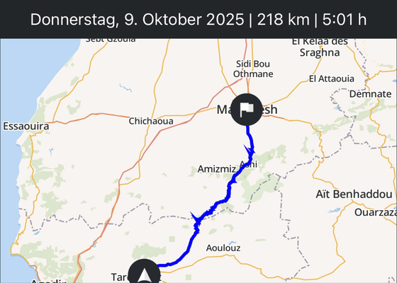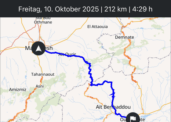 Unser heutiges Ziel sollte Marrakech sein, wobei der Weg durch den Atlas über die N7 eine Fahrt ins Ungewisse war. Denn bereits gestern hatten wir erfahren, dass die Passstrasse durch das Erdbeben vom 8. September 2023 völlig zerstört wurde und sich teilweise noch im Bau befindet. Wir wagten dennoch die Route über die 2000 Höhenmeter und starteten nach einem ausgiebigen Frühstück kurz vor 9 Uhr die Maschinen. Bereits ab Kilometer 50 begannen die ersten Baustellen, welche in Marokko grundsätzlich immer etwas abenteuerlich, ohne Asphalt und mittendurch sind. Ganz entgegen unserer diesjährigen Devise kein Offroad zu fahren, entpuppten sich die nächsten 100 Kilometer als reinste Schotterpiste. Der Staub war extrem und setzte sich auf Motorrad, Kleidung und Lunge. Das Ausmaß der Zerstörung durch die Naturgewalt war jedoch noch viel schlimmer. Ganze Berghänge waren abgerutscht und haben zahlreiche Bergdörfer unter sich begraben. Die Überlebenden hausen teilweise immer noch in Notunterkünften. Wir konnten lediglich ein paar Bonbons an die Kinder verteilen, bevor wir nach 218 Kilometern im überfüllten und 30 Grad Celsius warmen Marrakech landeten. Gegen 16 Uhr bezogen wir unser sehr schönes Riad mitten in der Medina, während unsere Motorräder vor den Mauern auf einem bewachten Parkplatz übernachten mussten. Am nächsten Tag erwartete uns das völlige Kontrastprogramm in Richtung Ouarzazate. Die Passstrasse N9 führte zwar ebenfalls bei 22 Grad Celsius über 2200 Höhenmeter, war aber mit ihren zwei bis drei Asphaltspuren ein echter Schräglagengenuss. Schnell zirkelten wir die Maschinen durch den Atlas und hielten lediglich zum Trinken oder Fotografieren von wunderschönen Oasen und Canyons entlang der P1506. Das berühmte Lehmdorf Aït-Ben-Haddou schauten wir uns nur von Weiten an, da uns die zahlreichen Busladungen für einen näheren Blick abschreckten. Und so trafen wir nach 212 Kilometern bereits 15 Uhr im Hotel ein und entspannen am Pool.