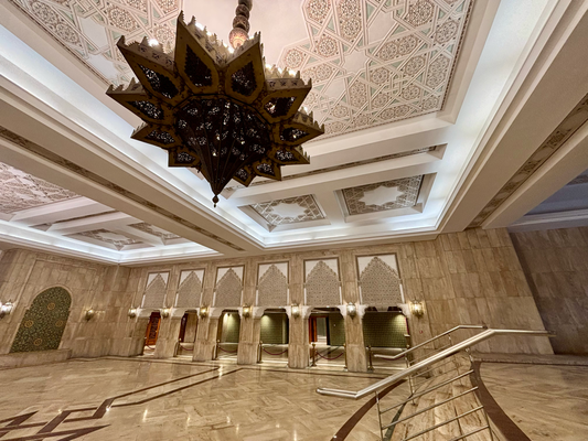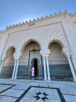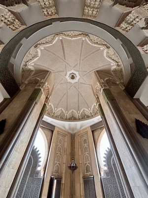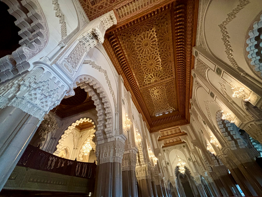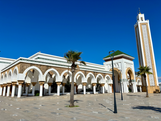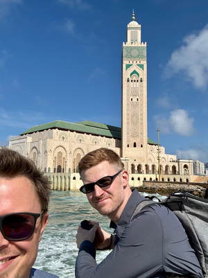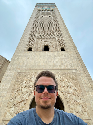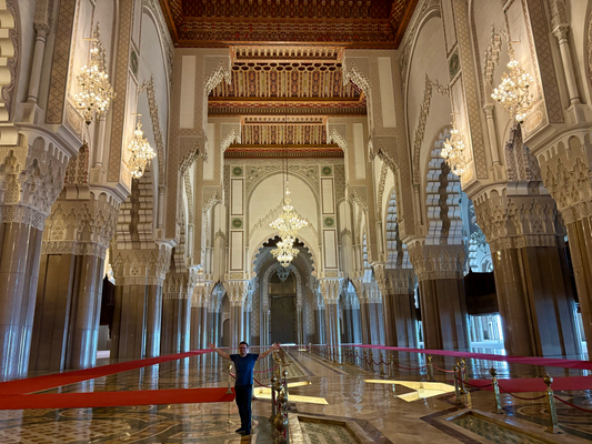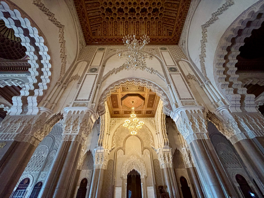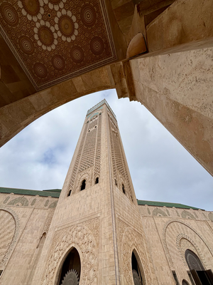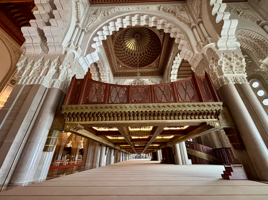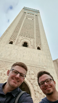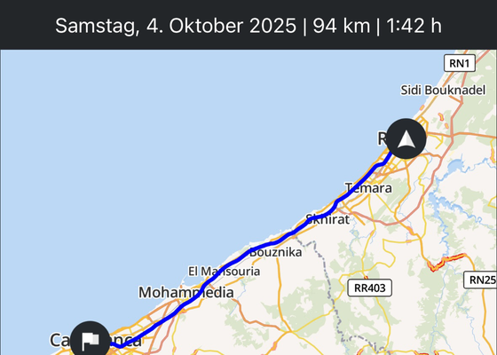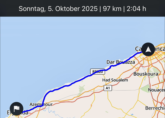 Den heutigen Tag konnten wir ganz entspannt angehen lassen, da lediglich 94 Kilometer Autobahn bei 27 Grad Celsius und Sonne bis Casablanca anstanden. Also gab es erst 9 Uhr Frühstück und wir konnten uns frisch gestärkt in den chaotischen Stadtverkehr stürzen, sowie der Herausforderung von dreispurigen Kreisverkehren stellen. Wobei man sagen muss, dass Chaos nur der erste Eindruck ist, denn irgendwie fließt es trotzdem und es wird auch tatsächlich Rücksicht genommen. Richtungsspuren, Zebrastreifen, Vorfahrtsregeln und auch manchmal Ampeln dienen lediglich als Empfehlungen. Solange man sich defensiv verhält und langsam fährt, kommt man ganz gut durch. Und so erreichten wir auch bereits 13 Uhr unser kleines Hotel, wo wir uns gleich nach einer erfrischenden Dusche fußläufig zu einer der größten Moscheen der Welt aufmachten. Die Hassan-II.-Moschee thront sehr eindrucksvoll mit ihrer 200 Meter hohen Minarett an der atlantischen Felsenküste. Das Bauwerk wurde 1993 fertiggestellt und kann bis zu 25.000 Personen in der Gebetshalle aufnehmen. Darunter befinden sich eine Madrasa (Koranschule) und ein Hammam (Bad), sowie eine Bibliothek, ein Museum und mehrere Konferenzräume. Schwer beeindruckt verließen wir nach zwei Stunden das hauptsächlich aus Granit und Zedernholz errichtete Gebäude, bevor sich die schweren Tore hinter uns schlossen und der Muezzin zum Nachmittagsgebet aufrief.