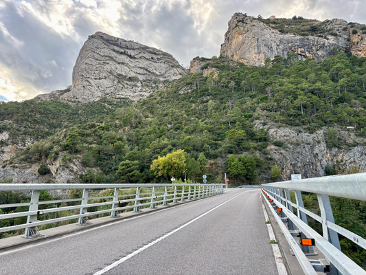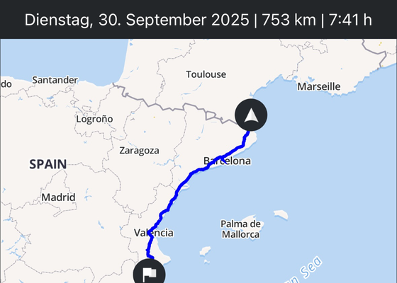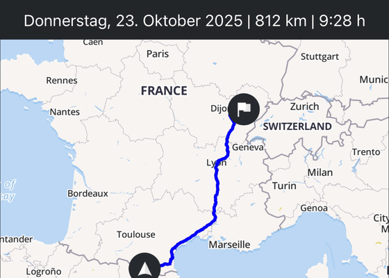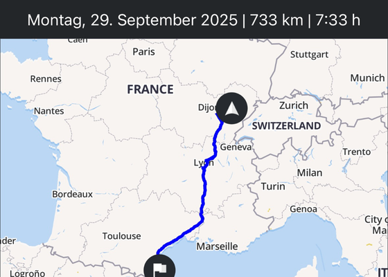 Die Reise begann von zu Hause aus mit einem liebevollen und ausgiebigen Frühstück, denn schon am ersten Tag sollten 880 Kilometer bei 16 Grad Celsius und einem Sonne-Wolken-Mix bis nach Frankreich absolviert werden. Geplant. Getan. Unspektakulär erreichten wir mit unseren vollgepackten Maschinen nach vier Tankstopps und zwei Staus kurz vor 20 Uhr unser Hotel in Besançon. Es war bereits dunkel und uns wurde bewusst, dass wir dieses Jahr aufgrund unserer herbstlichen Reisezeit mit kürzeren Tagen rechnen mussten. Also starteten wir am zweiten Tag schon 8.30 Uhr und spulten 733 Kilometer auf den französischen mautpflichtigen, aber sehr gut organisierten und informationsreichen Autobahnen ab. Das größte Phänomen war dabei das Wetter. Vormittags kämpften wir uns bei 8 Grad Celsius durch dichten Nebel, was sich besonders auf der Autobahn noch viel kälter und nasser anfühlt, um dann Nachmittags an der Mittelmeerküste mit 30 Grad Celsius und Sonne begrüßt zu werden. Mit knurrenden Mägen kamen wir 17 Uhr in unserem Hotel in Argelès-sur-Mer an, wo wir auch gleich das Restaurant zur Stärkung mittels leckerer Lammhaxe aufsuchten, um später nach einer überfälligen Dusche geschafft ins Bett zu fallen.