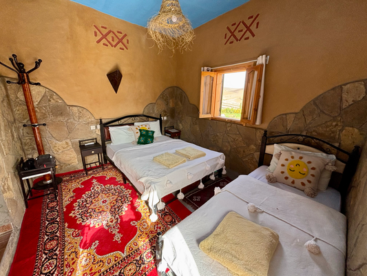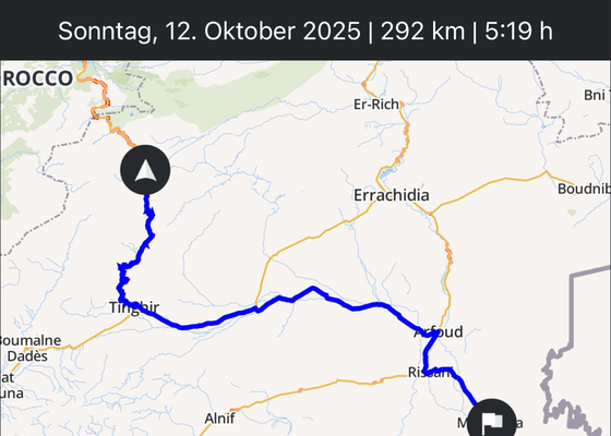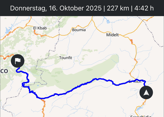 Nach einer zweitägigen Pause hieß es heute wieder rein in die staubige Motorradkombi und rauf auf das dreckige Motorrad. Das gehört bei einer Abenteuerreise durch Marokko einfach dazu. Gewaschen wird zu Hause. Wobei ich dieses Jahr ein neues Konzept bezüglich meiner Sachen erfolgreich getestet habe. Ich habe alte T-Shirts, Socken und Unterhosen bis zur Hälfte der Reise Stück für Stück abgestoßen und somit mein Reisegepäck kontinuierlich reduziert. So traten wir 10.30 Uhr bei 28 Grad Celsius den Rückweg in Richtung Norden an, um zum letzten Mal einen Blick auf die Dünen zu werfen. Geradlinig und flach führte uns die Straße vorbei an zahlreichen Fossilausgrabungsstätten bis an den Atlas, wo wir bereits nach 162 Kilometern unsere Kasbah beziehen konnten. Voller Vorfreude am darauffolgenden Tag durch das farbenfrohe und formenreiche Gebirge zu düsen, mussten wir feststellen, dass dies ohne Sonnenschein und bei 15 Grad Celsius erfolgen muss. Nichtsdestotrotz begeisterte uns die Fahrt durch abstrakte Hochebenen und abwechslungsreiche Kurven entlang der Berghänge. Leider gab es wieder einige schlammige Baustellen und sehr aufdringliche Bergdorfjungs, die direkt vor uns auf die Straße gesprungen kamen und aggressiv Geld erbettelten. Aber nicht mit uns. Süßigkeiten bekommen nur freundliche Kinder. Unfallfrei erreichten wir nach 227 Kilometern gegen 16 Uhr unsere abgelegene Kasbah Mourik, wo sich buchstäblich Fuchs und Hase gute Nacht sagen. Daher ist es wichtig, dass in allen Bergunterkünften kostengünstige Abendessen angeboten werden. Und so konnten wir für 130 Dirham pro Person ein leckeres drei Gänge-Menü samt Getränk als Tagesabschluss unser Eigenen nennen. Satt und ziemlich erschöpft fielen wir in unsere marokkanisch angenehm harten Betten.