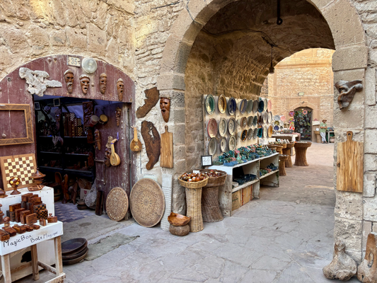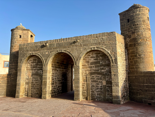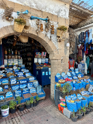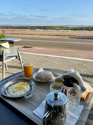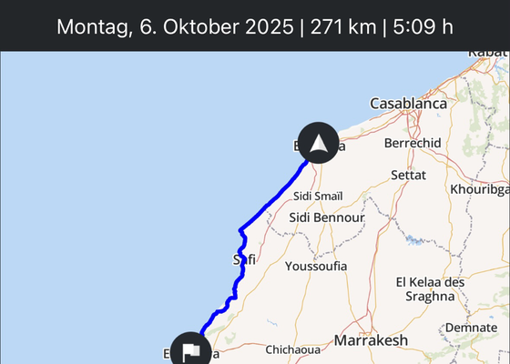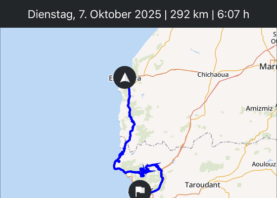 Erneut konnten wir uns mit dem Frühstück im Hotel Zeit lassen, da lediglich 97 Kilometer als Überlandfahrt bis El Jadida anstanden, wo auf uns eine Ferienwohnung mit direktem Blick auf das Meer und Tiefgaragenstellplatz wartete. Gegen 13 Uhr erreichten wir unser Domizil, duschten und machten uns abfahrbereit, denn heute hatten wir etwas ganz Besonderes vor. Matthias hatte ein Treffen mit den Eltern einer marokkanischen Freundin organisiert, die als Ingenieure in El Jadida leben. Sie holten uns 15 Uhr vom Appartement ab und fuhren mit uns in ihre Villa am Stadtrand. In einem riesigen Salon mit Couchlandschaft wurde uns leckerer marokkanischer Kuchen und Minztee serviert. Wir unterhielten uns über die arabische Kultur, das Essen, den Verkehr und das Leben in Marokko. Es war eine tolle Erfahrung mit ganz lieben Menschen, die uns obendrein noch ein typisch einheimisches Abendessen zauberten. Denn es gab neben Salat und Gemüse, ganz zartes Rindfleisch mit Datteln und Erdnüssen, was man sich mittels einem kleinen Stück Brot von einem gemeinsamen großen Teller herausnimmt und direkt isst. Satt und zufrieden fielen wir spät ins Bett bevor uns am nächsten Morgen das Meeresrauschen weckte. Frühstück gab es im benachbarten Café mit Blick auf den Strand bei angenehmen 22 Grad Celsius und Sonne. 10.30 Uhr starteten wir die Maschinen und fuhren entlang der Atlantikküste weiter in Richtung Süden. Es wurde staubiger und sandiger. Nach 271 Kilometern kamen wir in unserem niedlichen Hotel im Stadtkern von Essaouira an und stürzten uns nach 17 Uhr ins Getümmel. Zum Abendessen gönnten wir uns eine typische Tajine samt Minztee. Lecker.