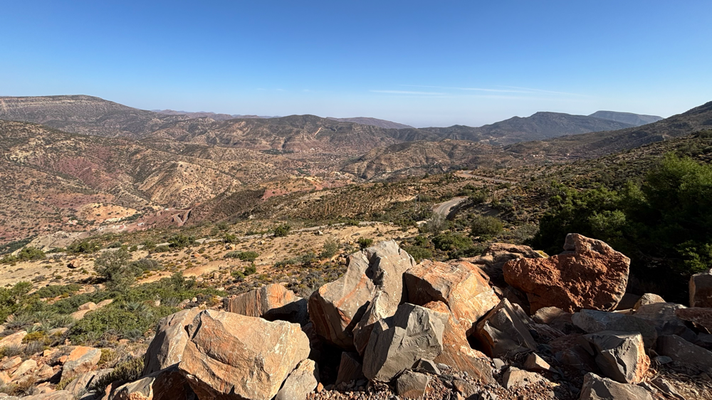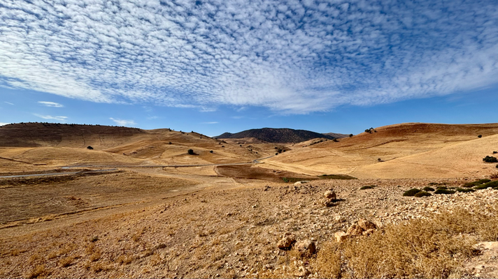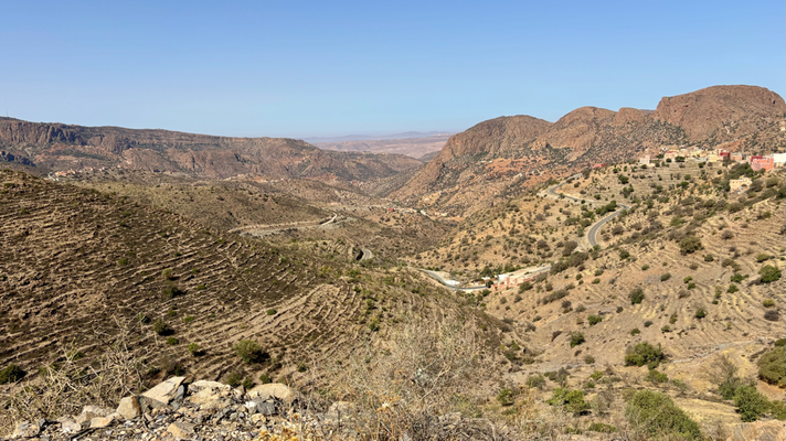Vor der Abreise nach Agadir gegen 10 Uhr musste ich zunächst einen niedlichen Strassentiger wecken, der es sich nachtsüber auf meiner Rücksitzbank gemütlich gemacht hat. Das ist vorallem in den marokkanischen Städten nicht selten, denn hier gibt es extrem viele streunende Katzen und Hunde, die aber von allen Menschen respektiert und auch gefüttert werden. Grundsätzlich muss man sagen, dass überall aufeinander geachtet und gesorgt wird, auch wenn es für uns Europäer manchmal einen befremdlichen Eindruck macht. Es stehen zum Beispiel viele Menschen am Strassenrand, vorallem im ländlichen Raum, die einfach nur zum Einkauf in die Stadt o.ä. mitfahren wollen. Selbst auf den Autobahnen. Es funktioniert. Heute sollten wir jedoch zum ersten Mal kaum Menschen unterwegs antreffen, denn es ging ab Mittag in die westlichsten Ausläufer des Atlasgebirges und auf eine der schönsten Straßen, die wir bis jetzt gefahren sind. Serpentinen nebst atemberaubender Landschaften ohne Ende ganz für uns alleine. Da können die mit Touristen überfüllten Alpenpässe einpacken. So war es auch am nächsten Tag als wir gegen Mittag den südlichsten Punkt unserer Reise erreichten. Diesmal waren die Kurven schneller und die Landschaft kahler, aber die Ausblicke blieben sensationell. Wir bewegten uns größtenteils auf 1500 bis 1800 Höhenmeter und fuhren somit bei tatsächlich angenehmen 30 Grad Celsius samt kühlendem Fahrtwind, bevor wir kurz vor unserem Riad (Gästehaus) bei 40 Grad Celsius gegen 16 Uhr in Taroudannt ankamen. Den krönenden Tagesabschluss bildete eine kalte Dusche, die vegetarische Tajin und der Apfelkuchen der Herbergsmutter.