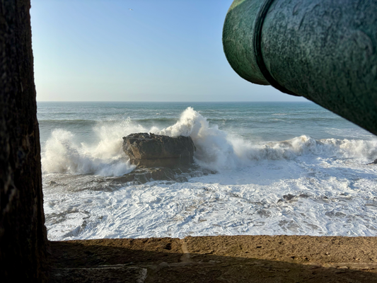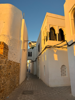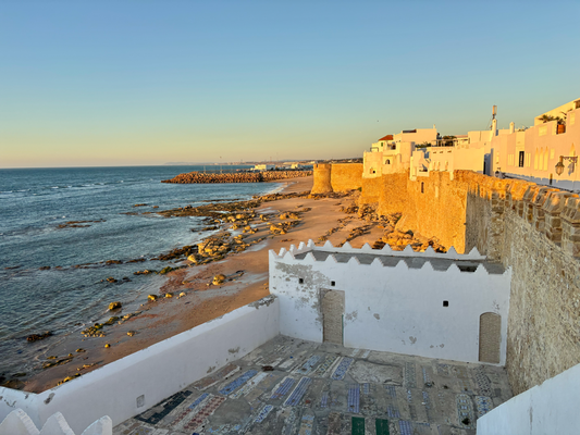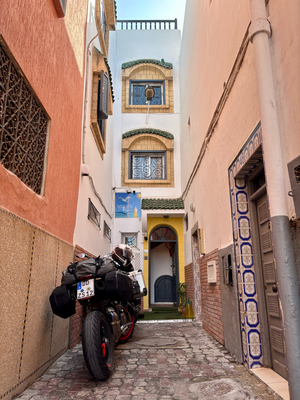 Nach 3.000 Kilometern durch Westeuropa und einem kolonial britischen Frühstück im passenden Speisezimmer konnten wir endlich gegen 11.30 Uhr in Algeciras unsere Fähre in Richtung Marokko zum Hafen von Tanger Med befahren. Die Motorräder wurden wieder gesichert und kaum hatten wir abgelegt, konnte man schon das Festland des afrikanischen Kontinents erspähen. Auf dem Schiff wurde innerhalb der drei Stunden Fahrzeit gleich die Passkontrolle durchgeführt, zu der wir vorher einen kleinen Zettel für das Visum ausfüllen mussten. Damit war die Einreise an Land relativ schnell abgewickelt und wir mussten lediglich noch drei Punkte abhaken: Haftplichtversicherung für Matthias sein Motorrad abschließen (bei mir ist Marokko zum Glück auf der grünen Versicherungskarte mit enthalten), Bargeld abheben (vorallem im ländlichen Raum, auf den Märkten und als Trinkgeld ist das wichtig, wobei man mit 2000 Dirham weit kommt) und SIM-Karte versorgen (20 GB plus 20 Minuten Telefonieren für 280 Dirham). Die ersten beiden Punkte konnten wir direkt im Hafengebiet erledigen und den letzten Punkt dann später in Asilah, unserem Tagesziel. Doch zunächst fuhren wir entlang der Küste durch Tanger, was uns mit seinem sauberen und modernen Stadtkern positiv überraschte. Wenige Kilometer weiter, hielten wir am Cap Spartel, wo sich das Mittelmeer und der Atlantik treffen, um dann in Richtung Süden gegen 18 Uhr und 170 Kilometern mehr auf dem Zähler, in unserem Hotel einzuchecken. Anschließend suchten wir die weißblaue und künstlerisch gestaltete Medina (Altstadt) von Asilah auf und genossen den Sonnenuntergang.