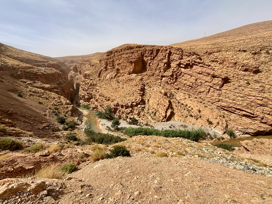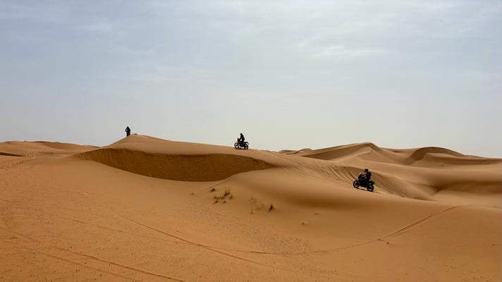 Ganz verwundert über den diesigen Morgen mussten wir feststellen, dass draußen ein heftiger Wind tobte, der in Marokko natürlich vorrangig Sand aufwirbelt und die Atmosphäre trübt. Ungeachtet dessen, stürzten wir uns ab 9.30 Uhr bei angenehmen 20 Grad Celsius in den Orkan und hofften im Dadestal auf Besserung der Sichtverhältnisse. Teilweise ging die Rechnung auf und es offenbarten sich atemberaubende Schluchten, die uns zu mehreren Fotostops verleiteten. Wir schraubten uns bis auf fast 3000 Höhenmeter und genossen immer wieder die sensationellen Ausblicke auf die Canyons und runden Berggipfel. Kurz vor 16 Uhr erreichten wir mit fast leerem Tank unsere rustikale Herberge in Agoudal auf 2400 Höhenmeter, wo es selbstverständlich eine traditionelle Tajin samt Minztee zum Abendessen gab. Unser Gastgeber war sehr fürsorglich und fuhr sogar am nächsten Morgen bei 10 Grad Celsius mit ins Dorf, wo er mir das bessere Benzin organisierte. Denn richtige Tankstellen gibt es hier oben im Atlasgebirge nicht. Da ist man auf Bezindealer angewiesen. 5 Liter für 100 Dirham reichten mir durch das faszinierende Todratal bis nach Tinghir, wo ich wieder volltanken konnte. Denn wir mussten es heute noch bis in die Wüste bei Merzouga schaffen. Die Temperaturen stiegen, die Landschaft wurde flacher und kahler, die Strassen kilometerlang geradliniger und man musste sich vor Sandverwehungen in Acht nehmen. Nach 292 Kilometern und über 30 Grad Celsius erblickten wir die Dünen der Erg Chebbi Wüste. Direkt am Rand stand unsere noch rustikalere Unterkunft im Anwesen einer Berberfamilie. Die Motorräder sollten wir im zweiten Innenhof sicher abstellen, da sich diese nun 60 Stunden ausruhen durften und wir per Kamel unsere Reise im Sand fortsetzen werden.