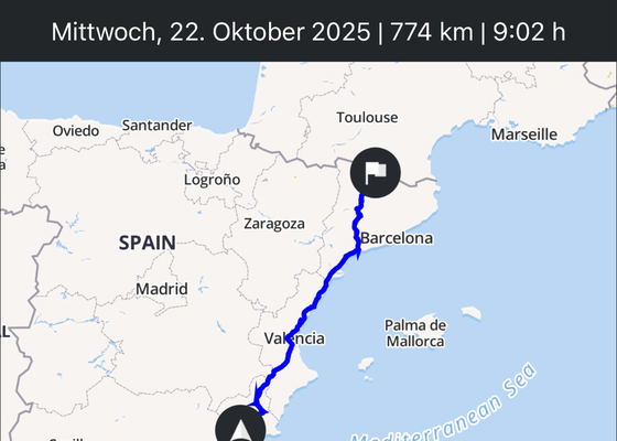 Meine Heimreise innerhalb von vier Tagen quer durch Westeuropa sollte nochmal alles abverlangen. Doch zunächst stärkten wir uns ein letztes Mal mit marokkanischen Frühstück und eilten 9 Uhr zum Hafen. Fristgerecht nahmen wir unsere Tickets entgegen und steuerten unsere Fähre an, welche 10.30 Uhr ablegen sollte. Allerdings hatten wir die Rechnung ohne die marokkanischen Grenzbeamten gemacht. Die Passkontrolle war kein Problem, aber unsere Fahrzeugpapiere wurden über eine halbe Stunde lang geprüft und keiner konnte englisch, um uns zu informieren. Irgendwann hatten wir unsere Dokumente zurück und das nächste Hindernis folgte keine 50 Meter weiter. Alle Fahrzeuge mussten zum Röntgenscan anstehen und danach gab es noch eine Durchsuchung mit Drogenspürhunden. Was für ein Desaster. Nach insgesamt über zwei Stunden Ausreiseprozedur kamen wir am Terminal an und sahen unsere Fähre auslaufen. Stinksauer mussten wir nun drei Stunden Däumchen drehen und mit dem nächsten Schiff 13.30 Uhr übersetzen. In Europa angekommen, trennten sich unsere Wege. Matthias fuhr noch eine Woche länger durch Portugal, während ich die direkte Route zurück nach Hause nahm. 22 Uhr erreichte ich nach dunklen 467 Kilometern mein Hotel in Lorca, das zum Glück noch bis 23 Uhr offene Küche hatte. Am nächsten Tag sauste ich 774 Kilometer bei angenehmen 20 Grad Celsius und Sonnenschein die spanische Ostküste in Richtung Norden bis nach Andorra. Leider konnte ich nur Bruchstücke von den beeindruckenden Pyrenäen erspähen, da ich mit wenig Zeit noch vor Einbruch der Dunkelheit im Skigebiet Soldeu sein wollte. Dankenswerterweise konnte ich die Maschine in der Tiefgarage des Hotels einparken, denn am darauffolgenden Tag war plötzlich Herbst. Regen, Nebel und Temperaturen von 8 Grad Celsius zwangen mich Pullover und Regenkombi anzuziehen, sowie die Heizgriffe einzuschalten. Schade, dass ich so die nördliche Seite der Gebirgskette zwischen Spanien und Frankreich nicht zu Gesicht bekam. Zurück an der französischen Mittelmeerküste gab es zwar keine Wolken mehr und die Temperaturen lagen bei 16 Grad Celsius, aber dafür tobte der heftigste Sturm, den ich bis dato noch nicht erlebt hatte. Unter voller Anspannung hangelte ich mich von Tankstop zu Tankstop, wobei das schlimmste Erlebnis eine Windböe war, die mich von der Mittelspur auf die rechte freie Fahrspur versetzte. Im Laufe des Tages drehte glücklicherweise der Wind und so konnte ich die Hälfte der 812 Kilometer mit Rückenwind in Richtung Besançon vorankommen. Froh alles gut überstanden zu haben, fiel ich im ersten Hotel dieser Reise erschöpft ins Bett. Die letzten 878 Kilometer bis nach Hause liefen trotz einstelliger Temperaturen erstaunlicherweise ganz gut, da es entgegen der Wettervorhersage nur zwei kleine Schauer unterwegs gab. Nach 10 Stunden Fahrt und vier Pausen war es geschafft. Mit 9632 Kilometer mehr auf dem Zähler und zahlreichen wundervollen Eindrücken, war ich allerdings auch froh, dass Mensch und Maschine so gut durchgehalten haben. Da hat sich meine Ducati Hypermotard 950 RVE eine ordentliche Dusche verdient.
